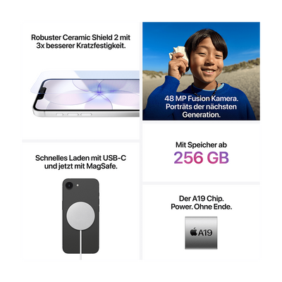 - SCHNELLES KABELLOSES LADEN. ALLES AUF EINEN KLICK MIT MAGSAFE. – Das iPhone 17e ermöglicht kabelloses Laden mit bis zu 15 W, im Vergleich zu 7,5 W beim iPhone 16e. Du kannst es also jederzeit einfach, bequem und schnell laden.